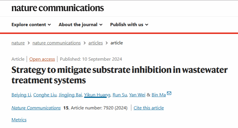 2024年9月10日,高水平学术期刊《Nature Communications》刊发了太阳成集团tyc马斌研究员团队的研究成果“Strategy to mitigate substrate inhibition in wastewater treatment systems”。太阳成集团博士生李倍莹为该文唯一第一作者,马斌研究员为独立通讯作者。