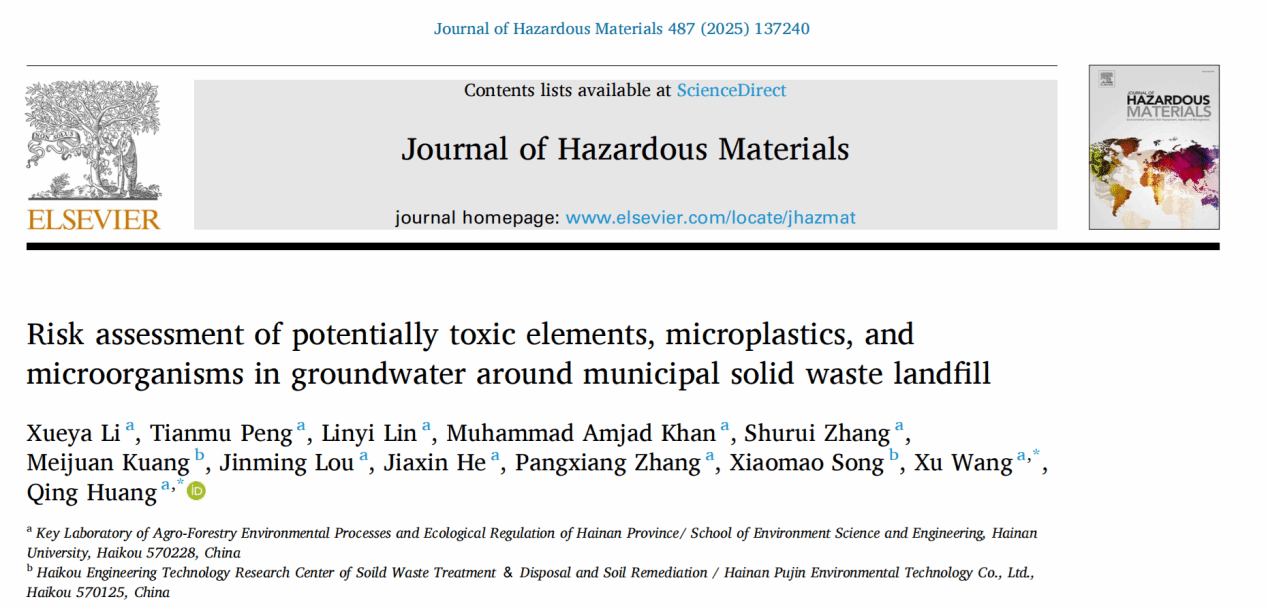近日,环境领域权威期刊《Journal of Hazardous Materials》(中科院一区TOP,IF2024=12.2)刊发了太阳成集团tyc黄青研究员团队的最新研究成果“Risk assessment of potentially toxic elements, microplastics, and microorganisms in groundwater around municipal solid waste landfill”。该论文以太阳成集团为第一通讯作者单位,太阳成集团2022级硕士研究生李学雅为该文唯一第一作者,黄青研究员为第一通讯作者,王旭副教授为共同通讯作者。