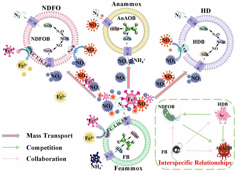 以铁还原耦合氨氧化为特点的Feammox过程在驱动地球生物铁/氮循环方面发挥着至关重要的作用。然而,该机制在面临环境胁迫时存在着运行规律、菌群互作与代谢响应不清晰等问题降低了其应用潜力。本研究以磁铁矿介导Feammox体系在不同环境胁迫(氮负荷率、碳氮比与水力停留时间)背景下的适应能力为切入点,发现Feammox菌群所特有的混养型铁还原能力可强化对自养环境、异养环境与水力冲击环境的快速适应。在分子生物学视角下,核心Feammox菌属C10-SB1A可选择性地与厌氧氨氧化菌属、铁基自养反硝化菌属与异养反硝化菌属进行代谢互作,大幅度提升体系对不同环境胁迫的耐受性。本研究深刻揭示多元化环境胁迫下的Feammox代谢调控机理,可为生物脱氮领域的技术革新提供详实的基础资料与科学依据。